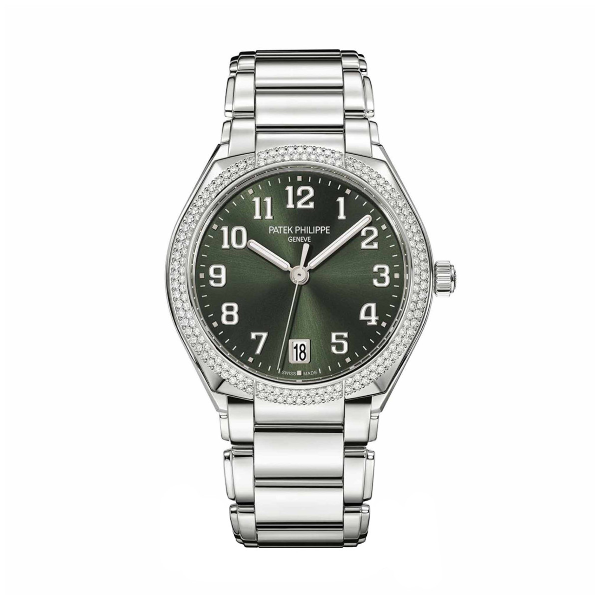 Ref. 7300/1200A-011 - Patek Philippe lanciert eine neue mechanische Damenuhr mit automatischem Aufzug, die aktive Frauen stilvoll begleitet: die Twenty~4 Automatik. Als neue Interpretation weiblicher Eleganz ist die Twenty~4 Automatik das erste Modell dieser Kollektion mit rundem Gehäuse. Die Edelstahl-Ausführung mit diamantbesetzter Lünette ist mit blauem oder grauem Zifferblatt erhältlich: in Blau mit Sonnenschliff, in Grau mit Sonnenschliff und Farbverlauf. Unter dem Saphirglasboden tickt das mechanische Uhrwerk 324 S C mit automatischem Aufzug, Stunde, Minute und Zentralsekunde sowie Datumsfenster bei 6 Uhr.
