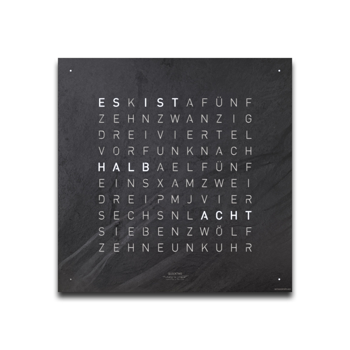 Für die QLOCKTWO CREATOR’S EDITION METAMORPHITE mussten 350 bis 400 Millionen Jahre Druck ausgeübt werden bis sich aus Tonschlamm grauer Schiefer gebildet hat, der letztendlich die Front einer QLOCKTWO ziert. Dieses spaltbare Gestein wird bis heute traditionell für den Dach- und Fassadenbau genutzt. Seine typische Farbe und die individuelle Struktur macht aus jeder Front der METAMORPHITE ein Unikat. Wie auch bei den anderen Modellen der CREATOR’S EDITION werden die Buchstaben zur Anzeige der Zeit aus dem Schiefermaterial herausgearbeitet.