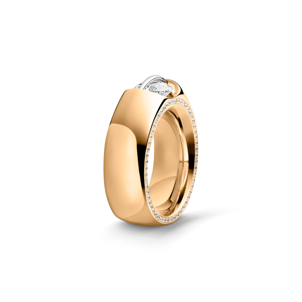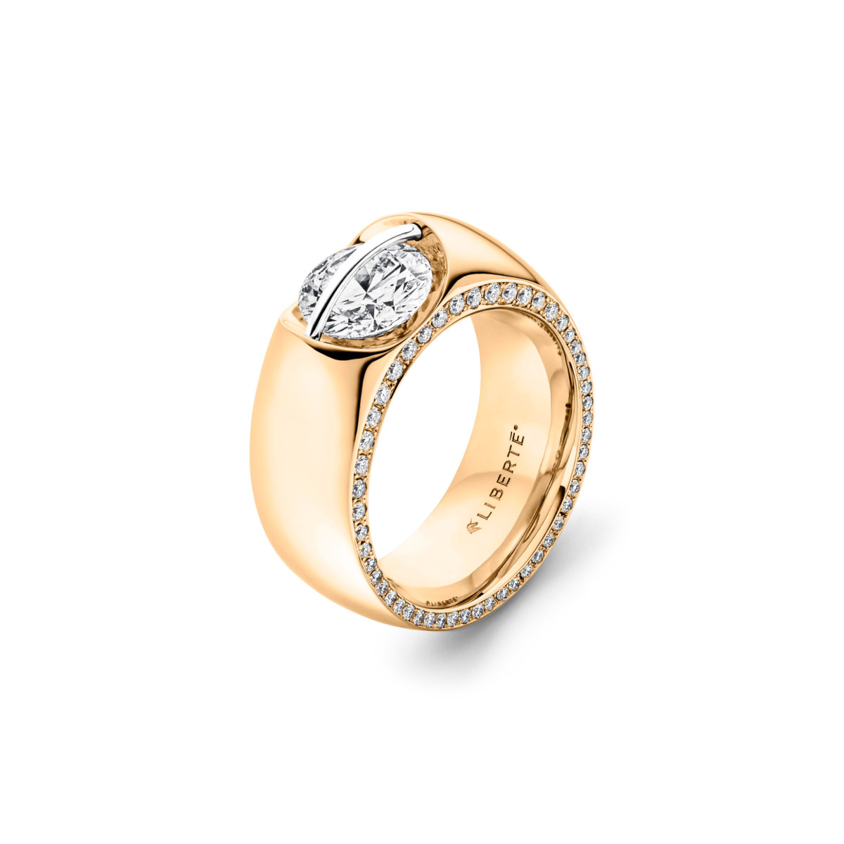 Ref. 118_L1062_200_GW - Mit dem Liberté® hat Schaffrath 2002 eine absolute Weltneuheit präsentiert und so ziemlich alle Kriterien des bis dato technisch Möglichen in der Diamantschmuckherstellung auf den Kopf gestellt. Während der Diamant in harkömmlichen Fassungen fest verankert ist, verleiht das patentierte Liberté®-Fassungssystem dem Stein eine vollkommene Bewegungsfreiheit von 360°. Mit atemberaubendem Ergebnis: Jede noch so kleine Bewegung verändert die Position des Diamanten und lässt ihn im Licht tanzen. Gleich einem funkelnden Feuerwerk wird das Licht von den unzähligen Facetten des Steins zurückgeworfen und strahlt so in allen Spektralfarben und in alle Richtungen. Mehr als 1000 Stunden Entwicklungszeit hat es gebraucht, um das Kunstwerk Liberté® zur Vollendung zu bringen.