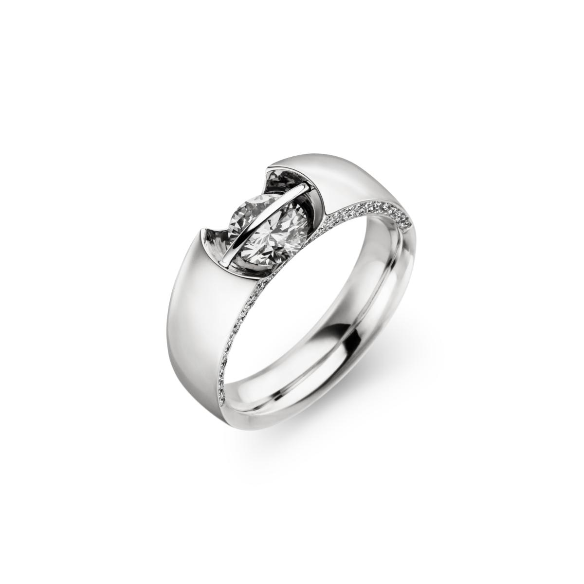 Ref. 218_L1090_70_WW - Mit dem Liberté® hat Schaffrath 2002 eine absolute Weltneuheit präsentiert und so ziemlich alle Kriterien des bis dato technisch Möglichen in der Diamantschmuckherstellung auf den Kopf gestellt. Während der Diamant in harkömmlichen Fassungen fest verankert ist, verleiht das patentierte Liberté®-Fassungssystem dem Stein eine vollkommene Bewegungsfreiheit von 360°. Mit atemberaubendem Ergebnis: Jede noch so kleine Bewegung verändert die Position des Diamanten und lässt ihn im Licht tanzen. Gleich einem funkelnden Feuerwerk wird das Licht von den unzähligen Facetten des Steins zurückgeworfen und strahlt so in allen Spektralfarben und in alle Richtungen. Mehr als 1000 Stunden Entwicklungszeit hat es gebraucht, um das Kunstwerk Liberté® zur Vollendung zu bringen.