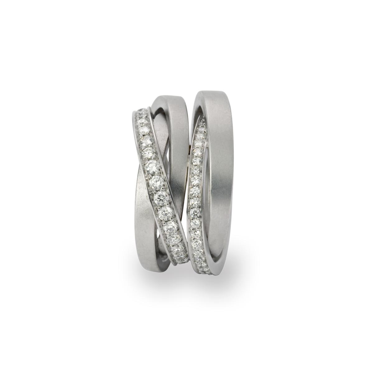 Ref. SR116-WG - Ordnung in der Unordnung. Jeder Ring besteht aus unterschiedlichsten Einzelringen. Schmaler, stärker oder schräger. Mit oder ohne Diamantlinien, die unter den Ringen verschwinden und wieder auftauchen. Sichtbares und Unsichtbares, ein ungeordnetes Durcheinander, das zur wunderschönen Einheit wird. Dreht man den Ring, sieht er immer wieder anders aus und erinnert an Unendlichkeit. Nur ein Spiel?