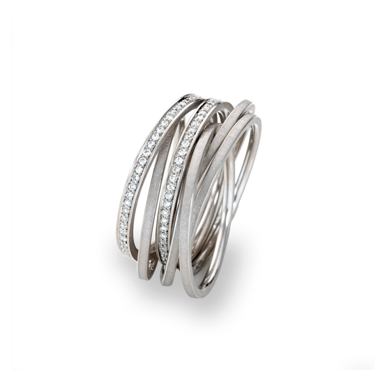 Ref. SR756-PT - Eine fesselnde Idee: Eine Kette wird zum Ring gewickelt. Ein Spielzeug für Frauen, das fasziniert und Spaß macht. 5 oder 7 Ringe greifen ineinander, breiten sich aus oder wachsen zusammen. Sie werden eingefädelt und ausgefädelt – Schmuck, der zum Erlebnis wird, natürlich auch mit Brillanten und Gebrauchsanleitung.