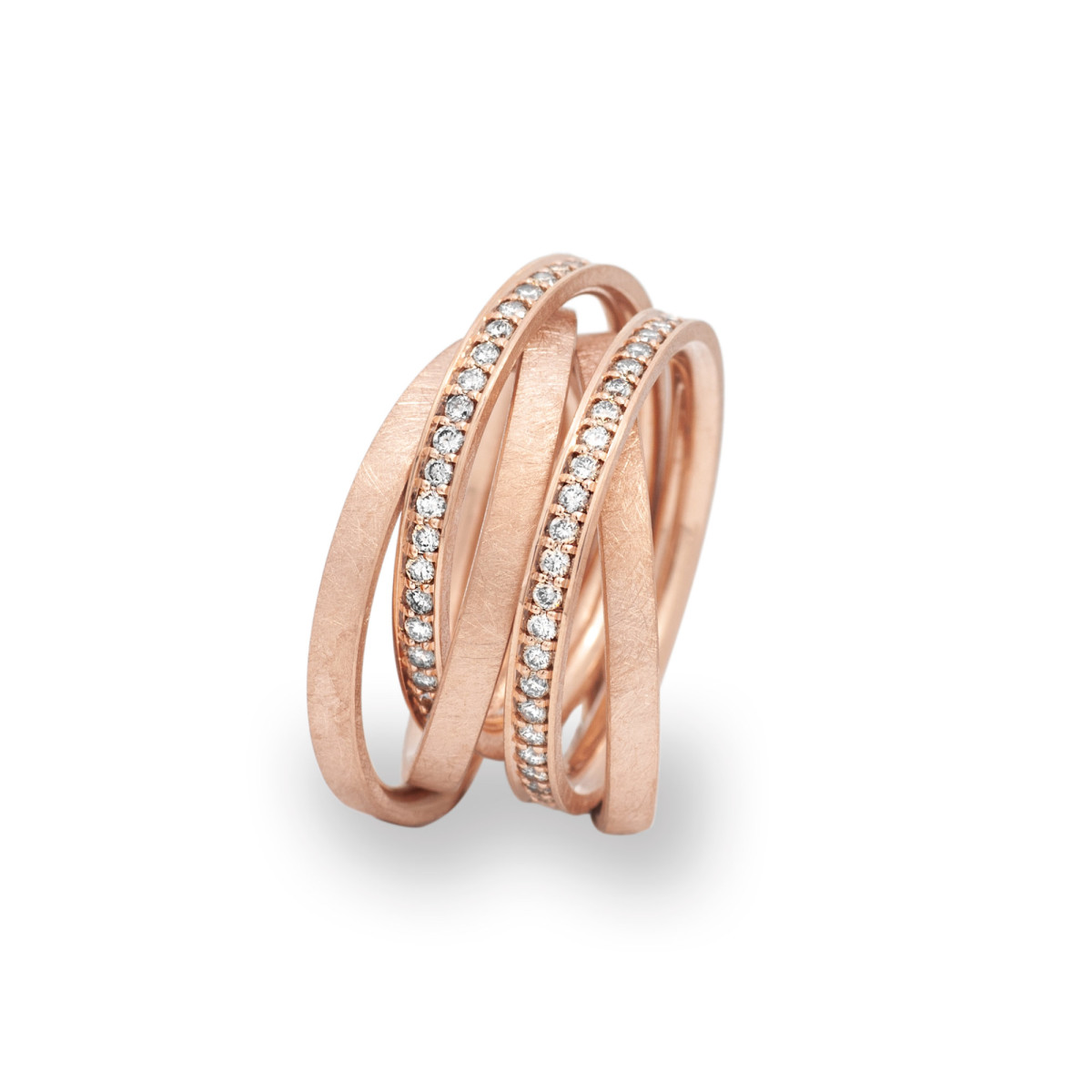 Ref. SR756-RG - Eine fesselnde Idee: Eine Kette wird zum Ring gewickelt. Ein Spielzeug für Frauen, das fasziniert und Spaß macht. 5 oder 7 Ringe greifen ineinander, breiten sich aus oder wachsen zusammen. Sie werden eingefädelt und ausgefädelt – Schmuck, der zum Erlebnis wird, natürlich auch mit Brillanten und Gebrauchsanleitung.