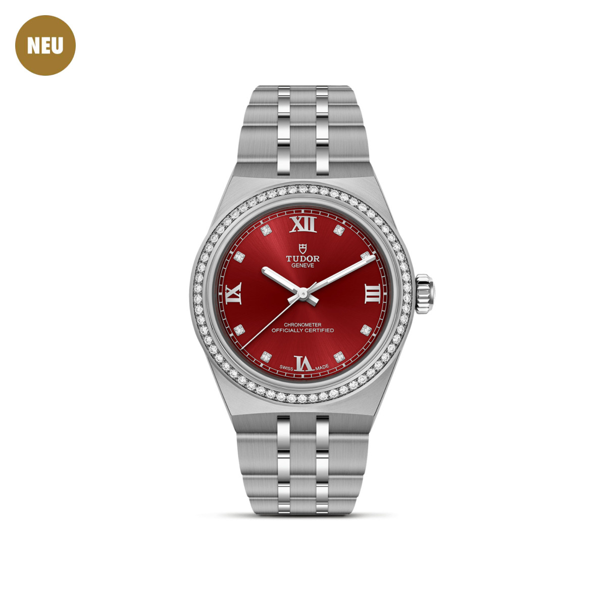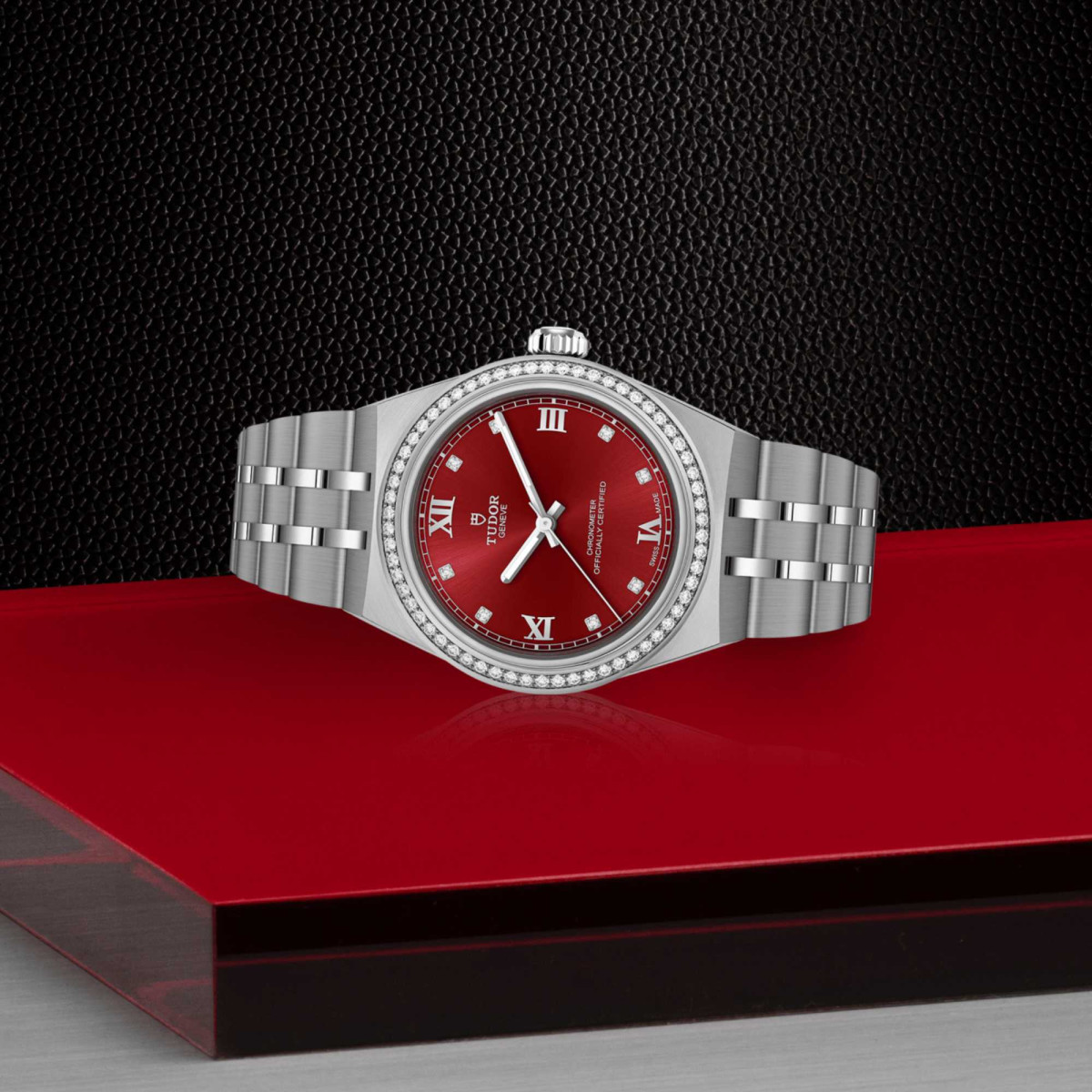 Bordeauxfarbenes Zifferblatt, applizierte römische Ziffern und Diamantindizes