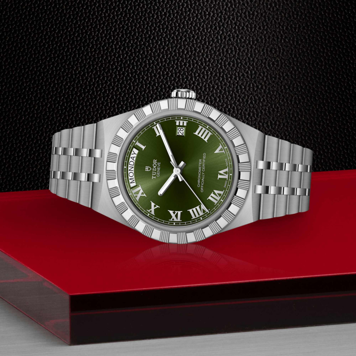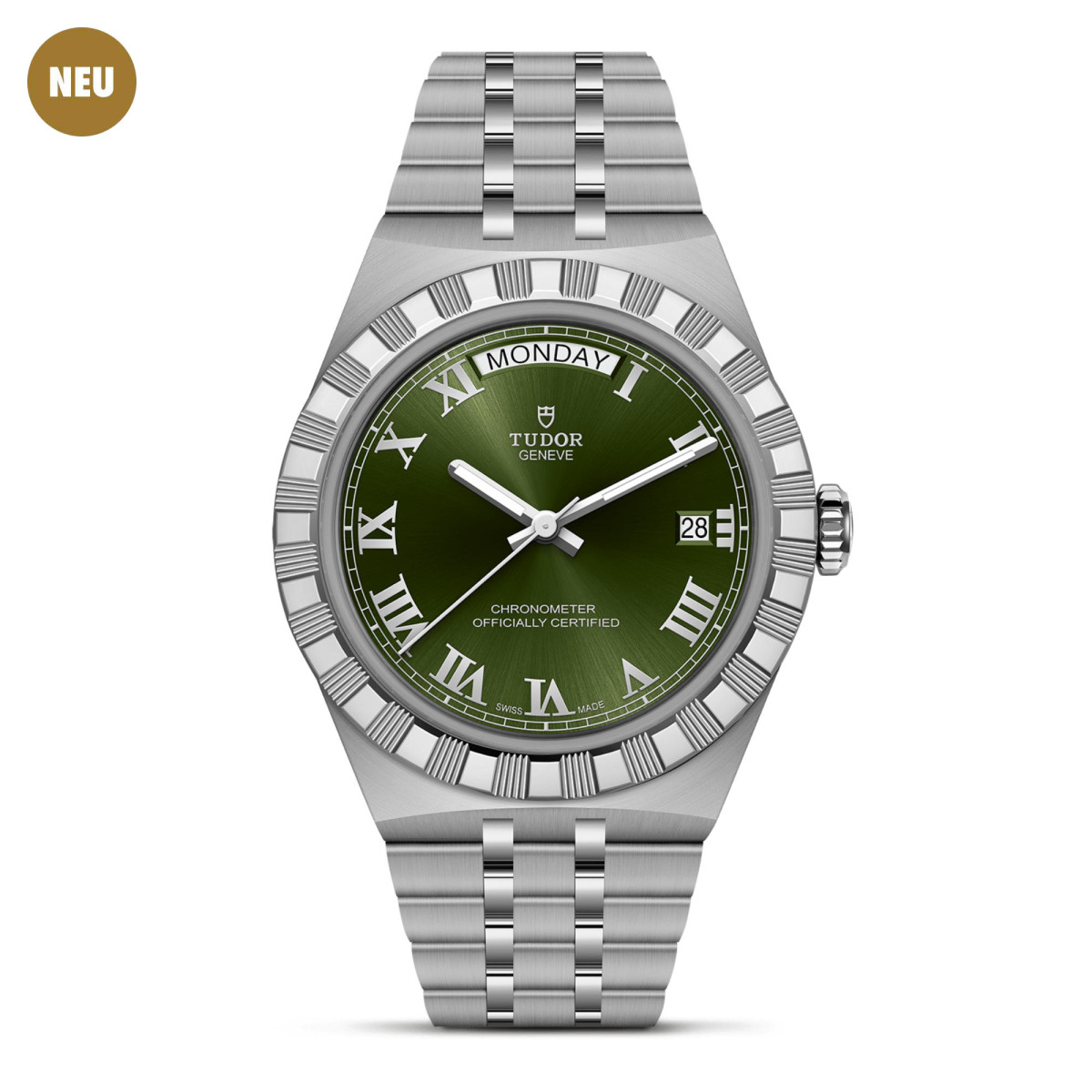 Ref. M2840D1A0-0003 - Mit ihrem integrierten Metallarmband, das nahtlos in das Gehäuse übergeht, zeichnet sich die TUDOR Royal durch ein fließendes und stilsicheres Design aus. Charakterisiert durch ihre drei breiten satinierten Bandelemente, zwischen denen zwei schmalere polierte Elemente positioniert sind, und ihre „T-fit“-Schließe, betont die glatte Beschaffenheit ihrer Oberflächen die große Aufmerksamkeit, die TUDOR dem Tragekomfort schenkt. Erhältlich in Edelstahl oder mit abwechselnden Elementen in Edelstahl und Gelbgold, sprechen die Modelle dieser Linie mit ihrer fein bearbeiteten Oberfläche jeden Geschmack an.