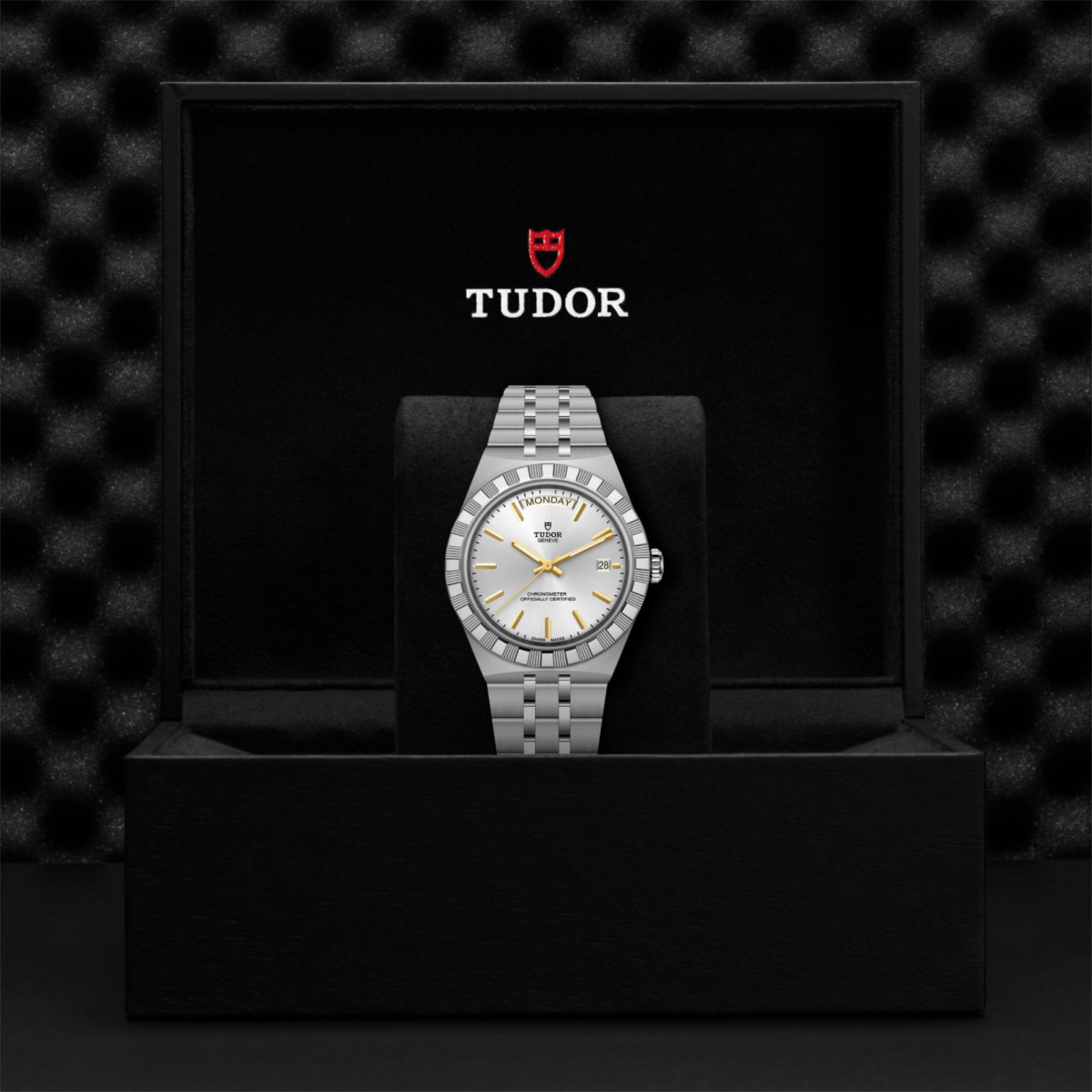 Ref. M2840D1A0-0004 - Mit ihrem integrierten Metallarmband, das nahtlos in das Gehäuse übergeht, zeichnet sich die TUDOR Royal durch ein fließendes und stilsicheres Design aus. Charakterisiert durch ihre drei breiten satinierten Bandelemente, zwischen denen zwei schmalere polierte Elemente positioniert sind, und ihre „T-fit“-Schließe, betont die glatte Beschaffenheit ihrer Oberflächen die große Aufmerksamkeit, die TUDOR dem Tragekomfort schenkt. Erhältlich in Edelstahl oder mit abwechselnden Elementen in Edelstahl und Gelbgold, sprechen die Modelle dieser Linie mit ihrer fein bearbeiteten Oberfläche jeden Geschmack an.