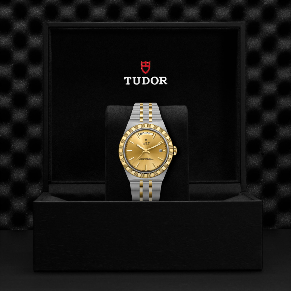 Ref. M2840D1A3-0002 - Mit ihrem integrierten Metallarmband, das nahtlos in das Gehäuse übergeht, zeichnet sich die TUDOR Royal durch ein fließendes und stilsicheres Design aus. Charakterisiert durch ihre drei breiten satinierten Bandelemente, zwischen denen zwei schmalere polierte Elemente positioniert sind, und ihre „T-fit“-Schließe, betont die glatte Beschaffenheit ihrer Oberflächen die große Aufmerksamkeit, die TUDOR dem Tragekomfort schenkt. Erhältlich in Edelstahl oder mit abwechselnden Elementen in Edelstahl und Gelbgold, sprechen die Modelle dieser Linie mit ihrer fein bearbeiteten Oberfläche jeden Geschmack an.