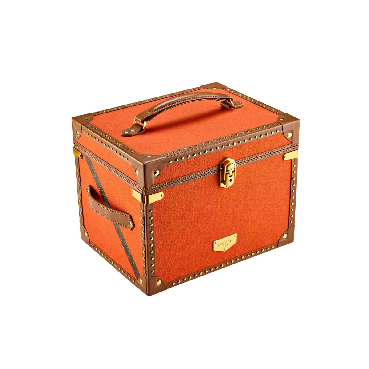 Ref. 190039 - Die wunderschöne Schmuckschatulle im Ida-Koffer-Stil verfügt über eine Außenhülle aus recycelten Materialien in luxuriösen Farbtönen mit Lederbesatz und Schubladengriffen. Entdecken Sie Messingnieten, ein speziell angefertigtes Schloss, eine exklusive Plakette zum 190-jährigen Jubiläum und Schutzecken, die von Idas Reisekoffer inspiriert sind. Im Inneren finden Sie das mit LusterLoc™ behandelte Ultrasuede-Futter in mehreren Schmuckfächern. Die oberste Schicht verfügt über Ringfächer und fünf offene Bereiche sowie ein abgedecktes Tablett mit einem großen Spiegel im Deckel, der nach vorne gezogen werden kann, um ein verstecktes Fach freizulegen. Sie finden drei weitere Schubladen mit Fächern für all Ihre Lieblingsschmuckstücke und ein kleines Reiseetui, das sich perfekt für alle Eventualitäten eignet.