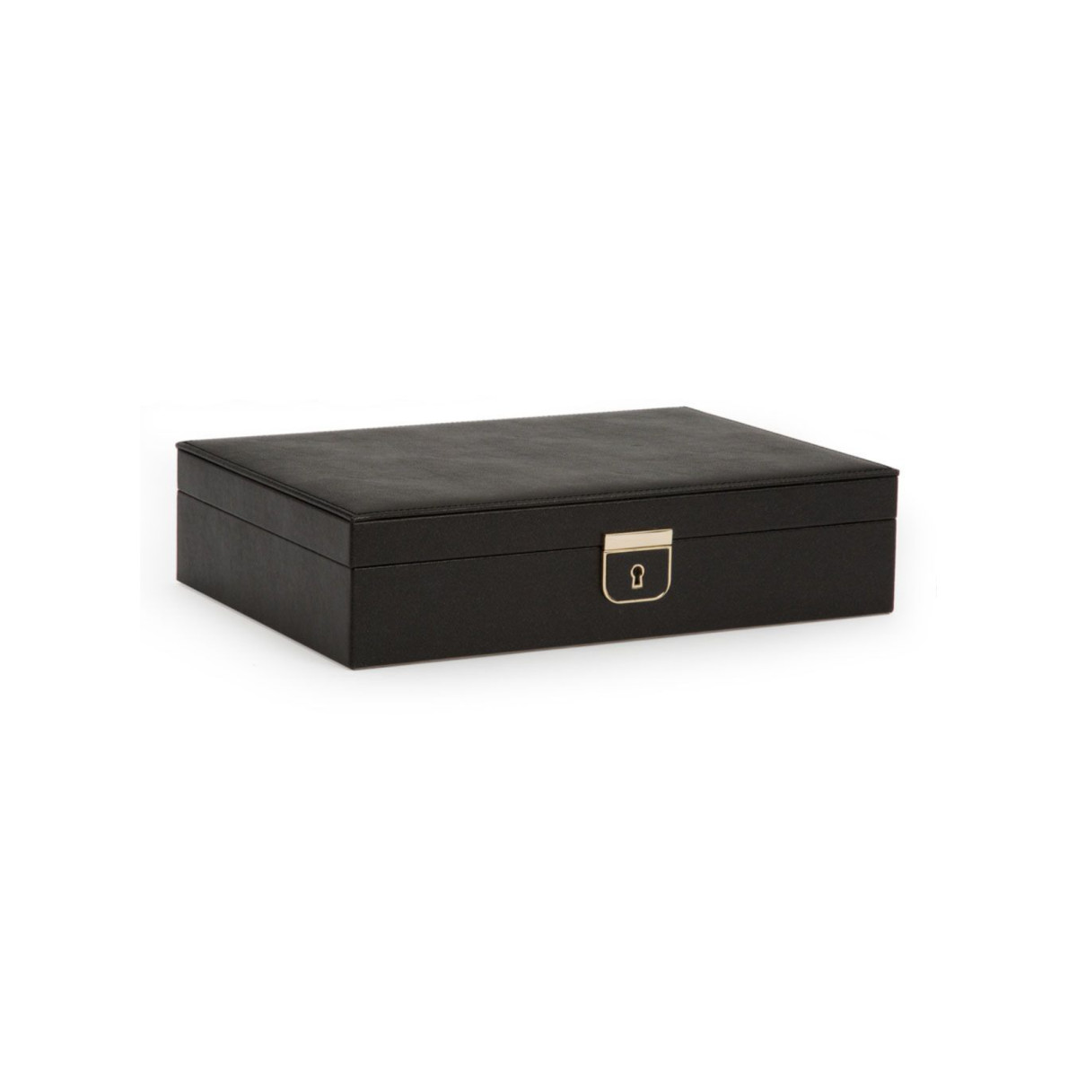 Ref. 213202 - Das charmante und elegante Palermo ist von seiner namensgebenden Stadt am Fuße eines Berges am Meer inspiriert. Mit seinem edlen schwarzen Anthrazitleder und den schicken versenkten Goldschlössern präsentiert und organisiert das Palermo Medium Schmuckkästchen Ihren Schmuck stilvoll. Mit LusterLoc™-Antianlauf-Futter und Schloss mit Schlüssel in Goldoptik.