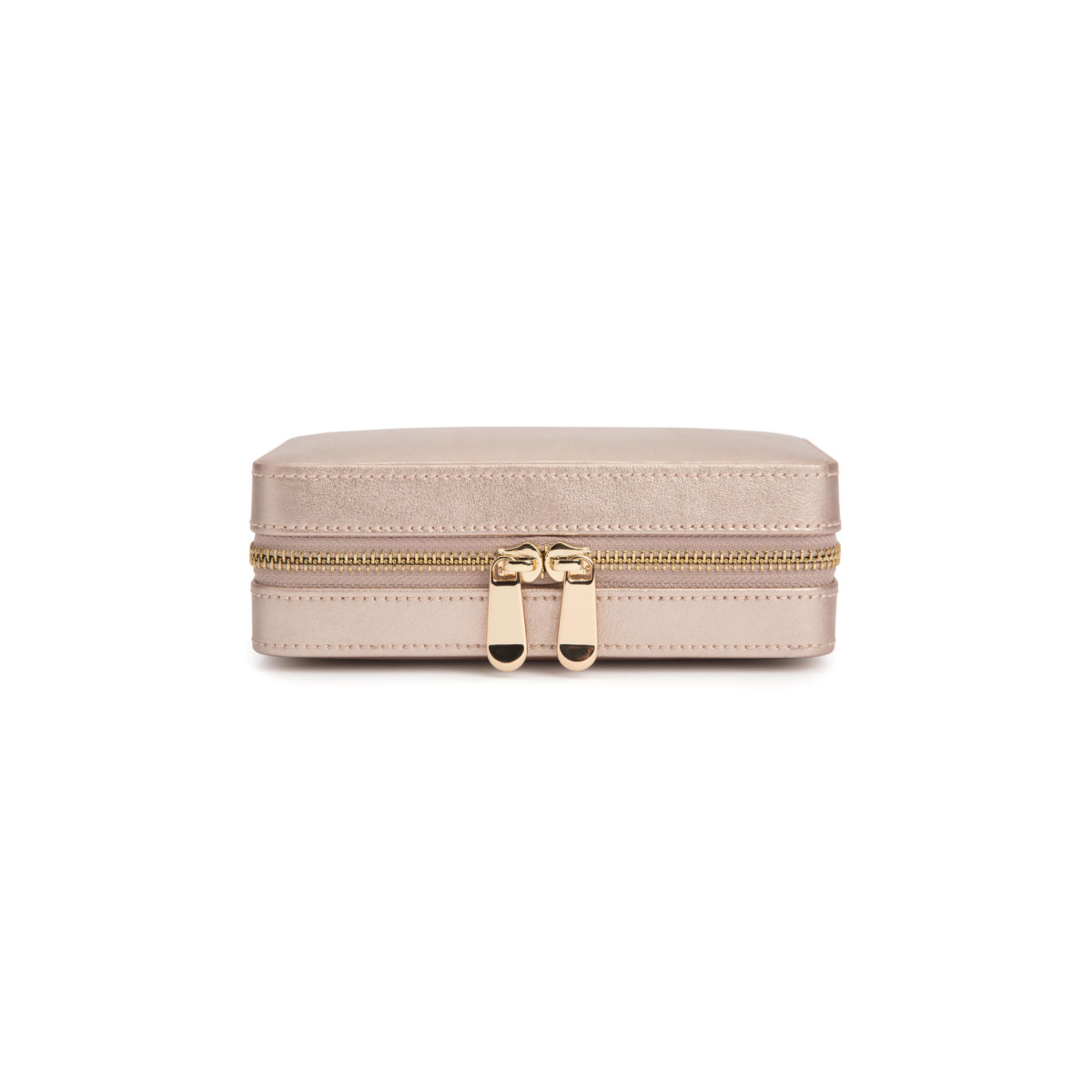 Ref. 213616 - Das charmante und elegante Palermo ist von seiner namensgebenden Stadt am Fuße eines Berges am Meer inspiriert. Bewahren Sie Ihre Lieblingsstücke auf Reisen in diesem luxuriösen Etui aus roségoldfarbenem Leder mit Reißverschluss auf. Mit LusterLoc™-Futter gegen Anlaufen und Schloss mit Schlüssel in Goldoptik.