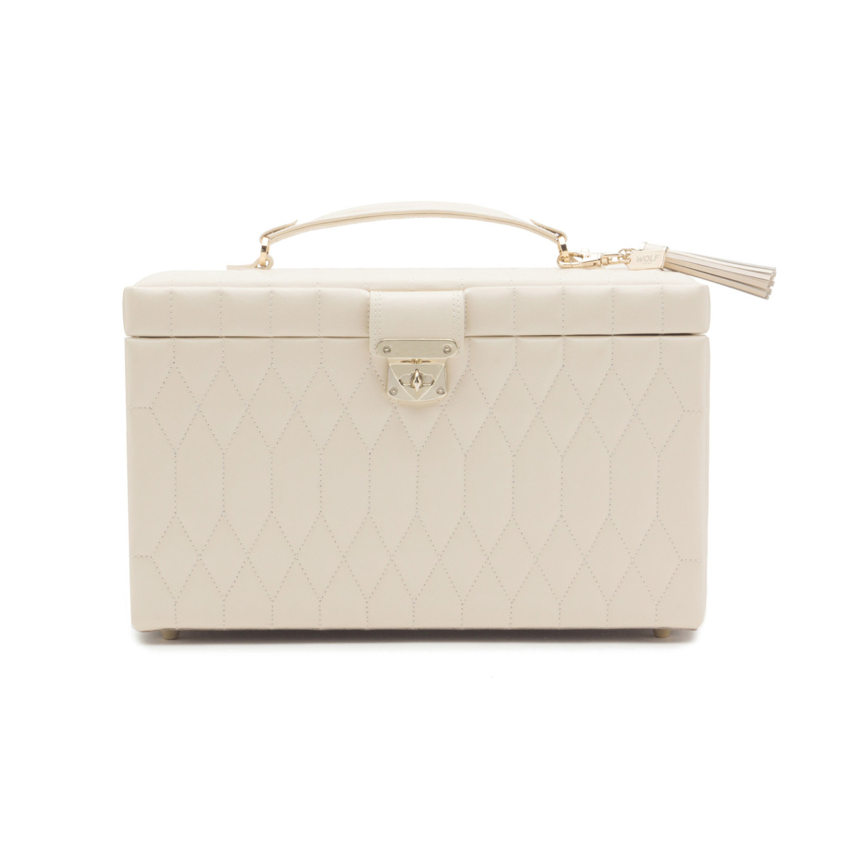 Ref. 329653 - Die Verkörperung von Raffinesse und Stil. Caroline, ein zeitloser Klassiker mit eleganten, weichen Linien der 50er Jahre, geschmeidigem, diamantgenähtem Leder und goldenen Metallbeschlägen. Dieses raffinierte Schmuckportfolio in Elfenbein ist der perfekte Aufbewahrungsort für Ihren kostbaren Schmuck und Ihre Erbstücke. Mit Caroline können Sie Ihren Schmuck auch unterwegs sicher aufbewahren.