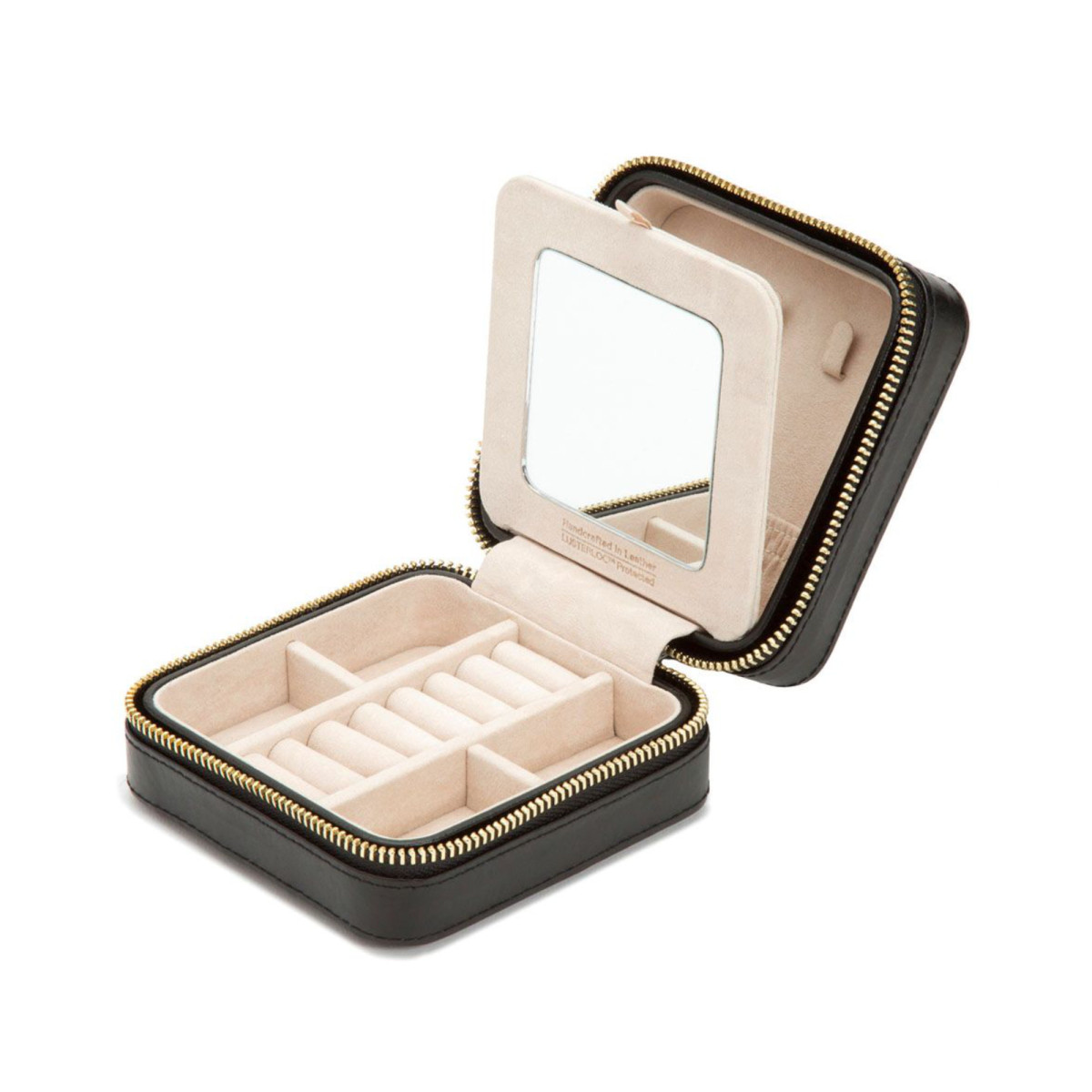 Ref. 329971 - Die Verkörperung von Raffinesse und Stil. Caroline, ein zeitloser Klassiker mit eleganten, weichen Linien der 50er Jahre, geschmeidigem, diamantgenähtem Leder und goldenen Metallbeschlägen. Diese elegante schwarze Reisetasche mit Reißverschluss ist der perfekte Aufbewahrungsort für Ihren kostbaren Schmuck und Ihre Erbstücke. Mit Caroline können Sie Ihren Schmuck auf Reisen ganz einfach sicher aufbewahren.