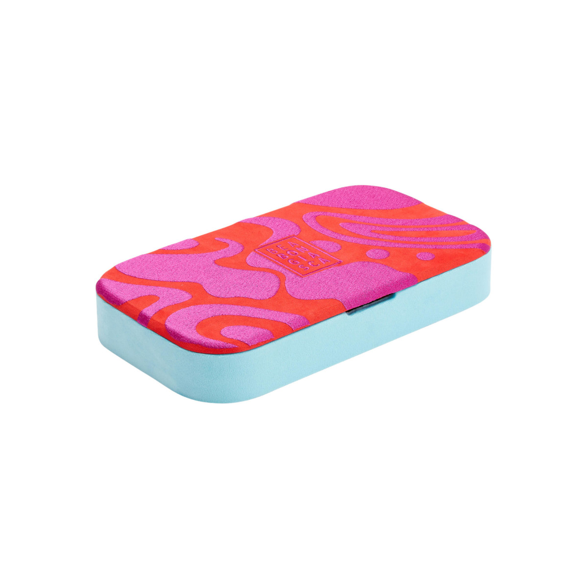 Ref. 882010 - WOLF revolutioniert weiterhin die Kunst der Boxenherstellung in dieser Zusammenarbeit mit der innovativen Schmuckdesignerin Bea Bongiasca. Inspiriert vom Stil der 70er Jahre bietet das Medium Tray eine praktische und schicke Aufbewahrungsmöglichkeit für Schmuck in auffälligen Farbkombinationen. Das Medium Tray wurde bewusst aus luxuriösem Velours und besticktem Mikro-Wildleder mit Akzenten aus veganem Leder entworfen und ist frei von tierischen Produkten und tierversuchsfrei. Dieses einzigartige Stück funktionaler Kunst kann Ihre Kommode oder Schubladen verschönern.